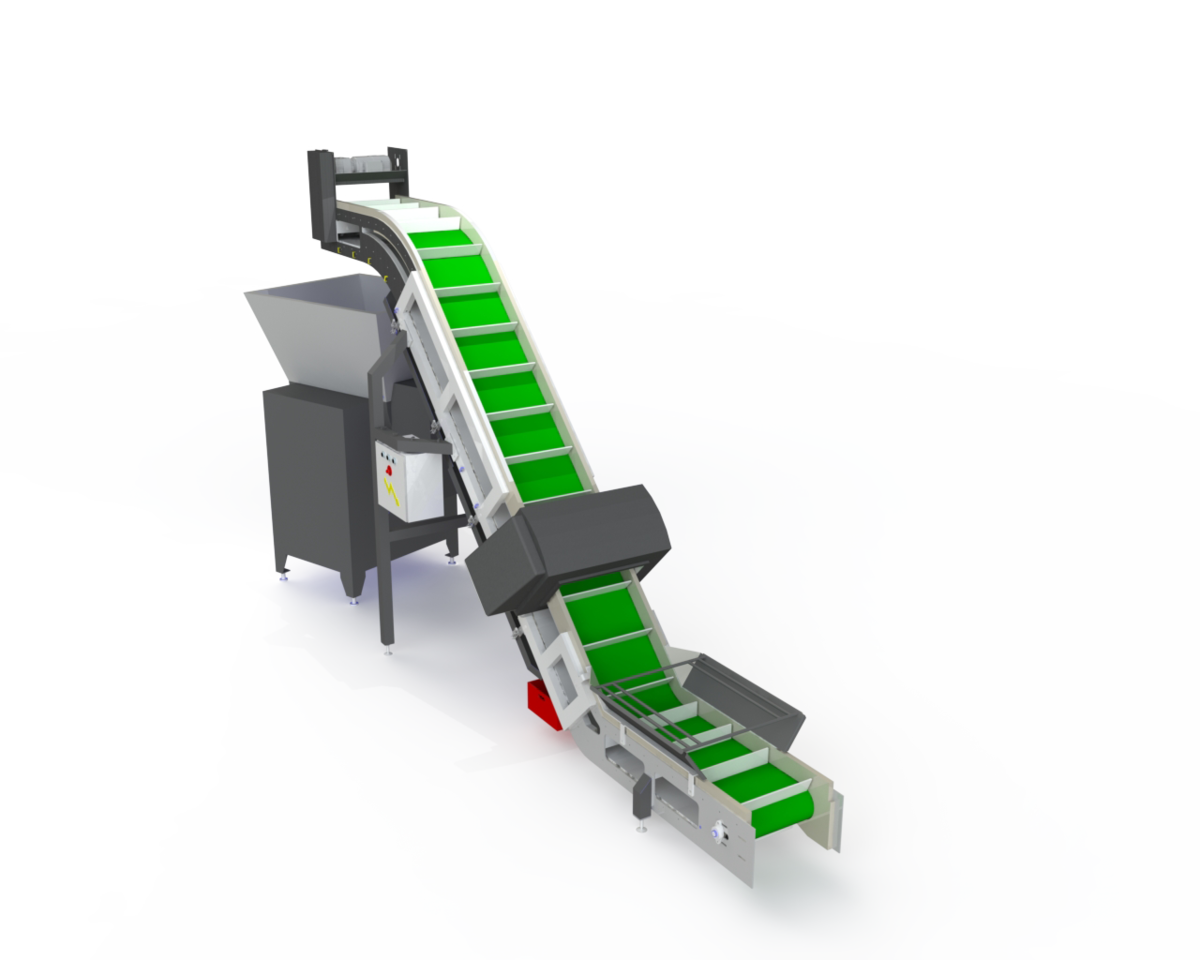 Steigband mit Detektor als Anwendung z.B. in einem Fleisch verarbeitenden Betrieb. Das Produkt wird durch eine metallfreie Zone auf eventuelle Fremdkörper kontrolliert, um eine einwandfreie Qualitätskontrolle zu gewährleisten.