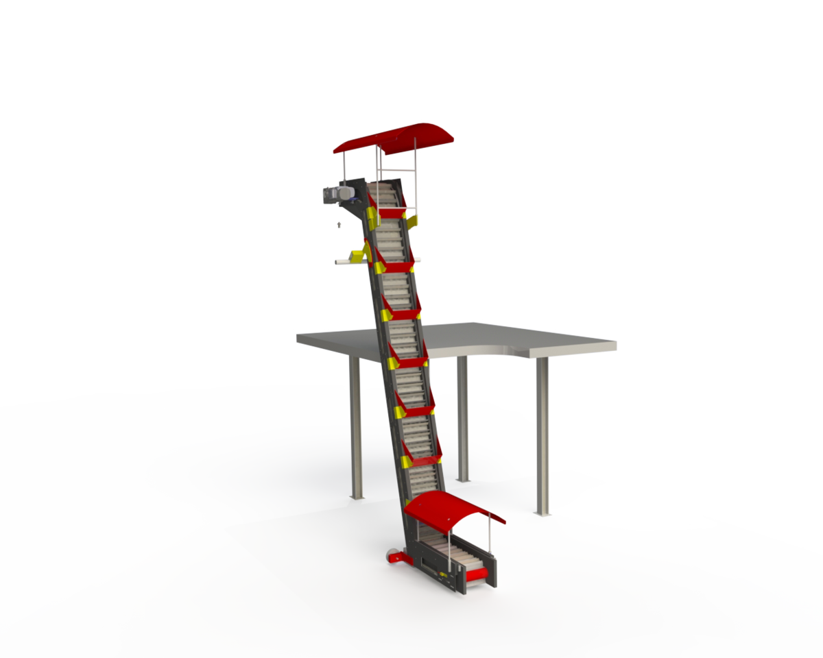 Steigband für die Lebensmittelindustrie in fast senkrechter Ausführung.